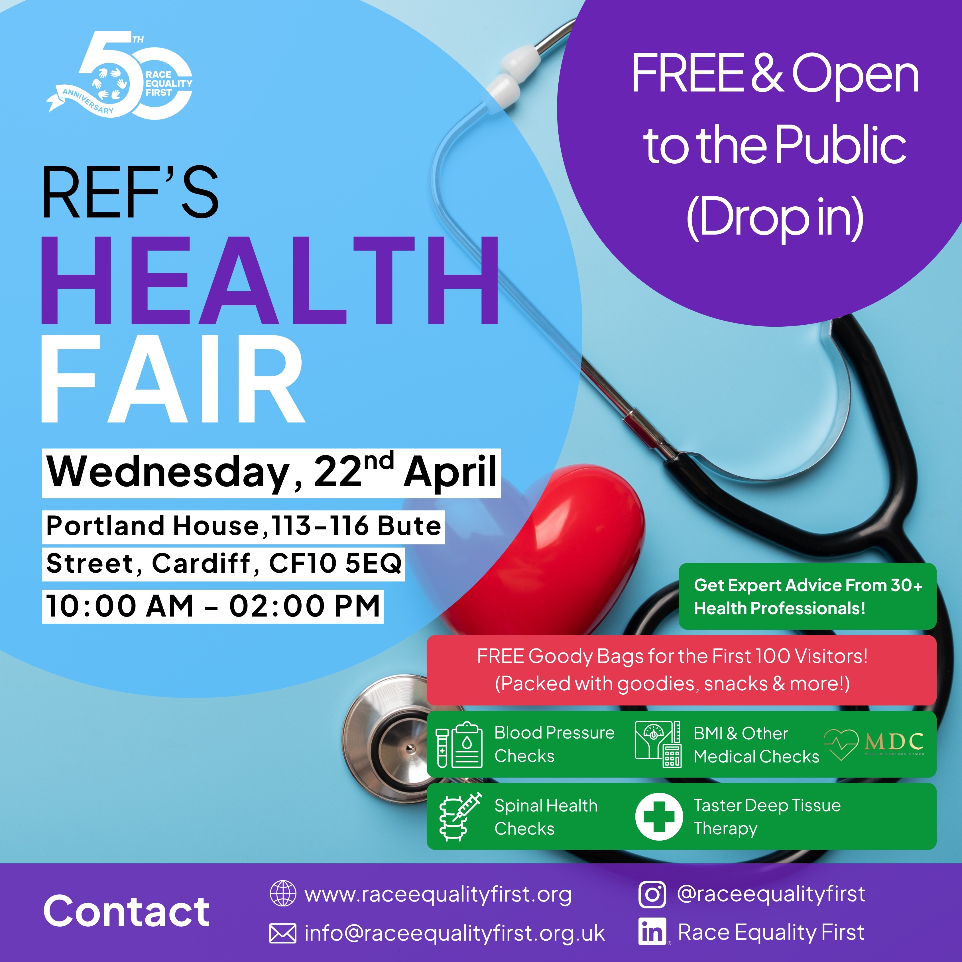 As part of Race Equality First’s 50th anniversary celebrations, we are hosting a Community Health Fair for the communities we serve across Cardiff and the surrounding areas.